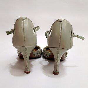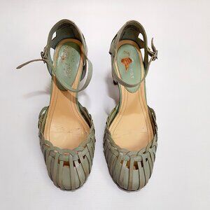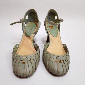 Romantic high heel strappy sandals from Nine West in a pastel mint green colour. Perfect for Spring and Summer looks. All leather with lattice weave pattern on the toe caps. Hand made in Brazil.