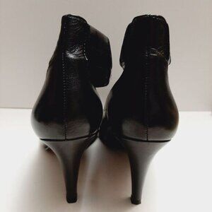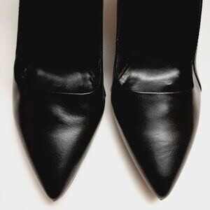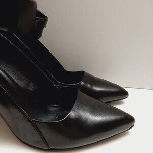 • Genuine leather slip on pointy toe heel shoes in black with stretch ankle strap. Style: Prep School