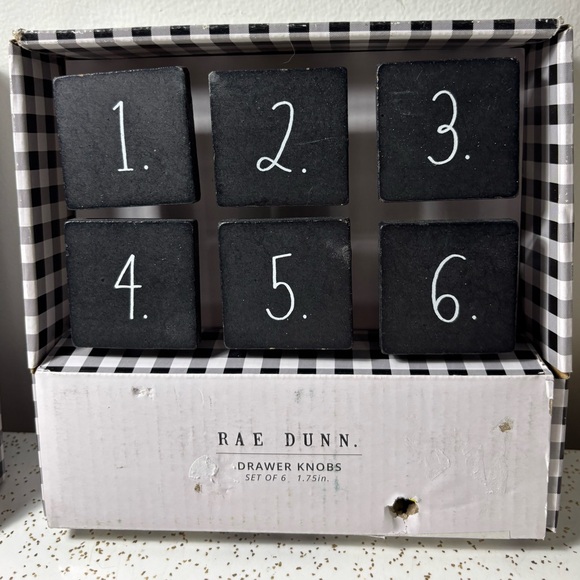 Brand new in package set of 6 Rae Dunn drawer knobs numbered 1-6 in the classic Rae Dunn script. Measure 1.75” across. I have a similar set to these with butterflies. Feel free to bundle to save shipping.