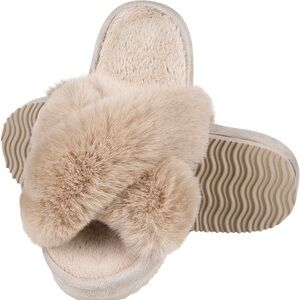 Tan fuzzy slipper slides