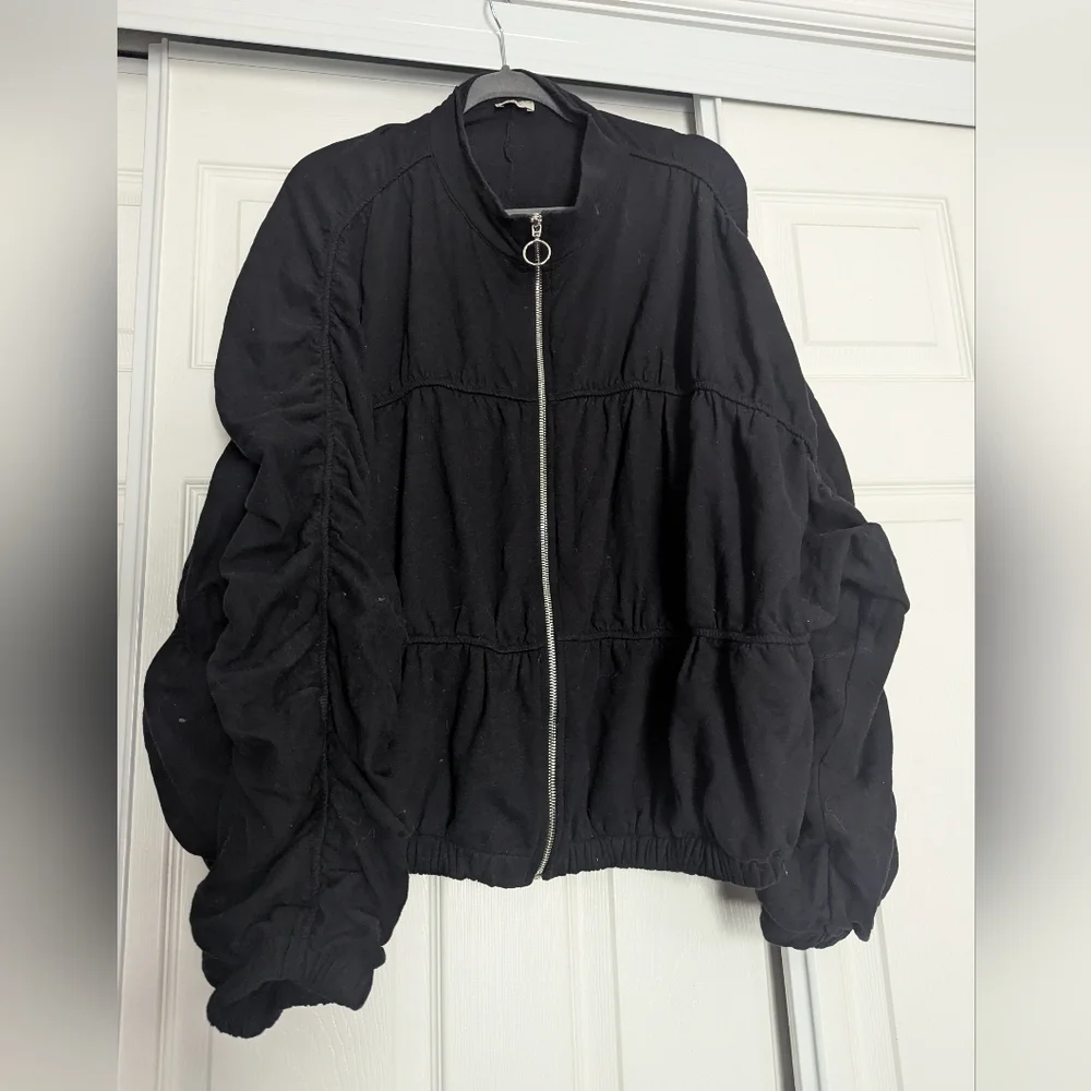 100% cotton black French terry track jacket with ruching detail from ethical LA designer No Less Than (NLT). size 3X. image of pink jacket just for illustration because the details are hard to see in the black. PTP =26". smoke free pet free home.