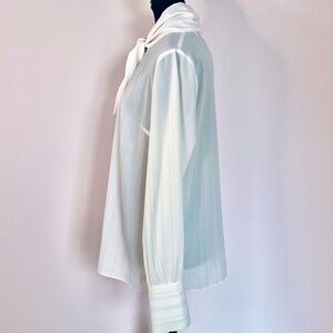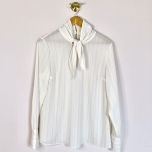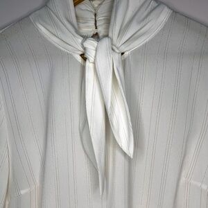 This Neiman Marcus blouse comes in soft cream with a delicate shimmer, featuring fine silver and gold lurex stripes that catch the light beautifully. With its tie-neck detail, long cuffed sleeves, and gently flowing silhouette, it’s perfect for soirées—or styled with wide-leg denim and leather boots for a modern look.
