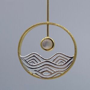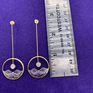 New item, no tags. Solid sterling 925 silver drop earring with 22 Karat gold vermeil accents. Distinctive wave design in mirror silver finish, hoop and drop in matt gold finish. Small bezel set stone (type unknown: looks like opal or moonstone with soft semi opaque finish)). Almost 3 inches in length. Handmade by superior craftsmen with remarkable attention to detail. Add some complimenting pieces from Our Closet (some suggestions shown, all priced separately). This is how we get fresh at Lemon Squeezy Shop🍋