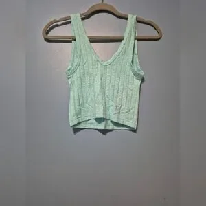 Sleeveless ribbed knit tank with a V neckline. Lightweight, breathable fabric. Cropped, straight hem for easy layering.
