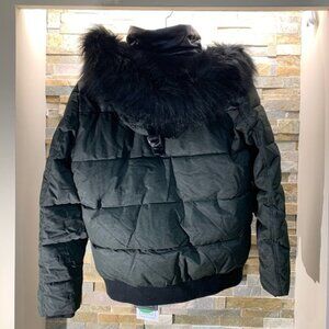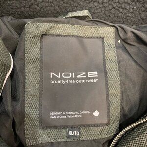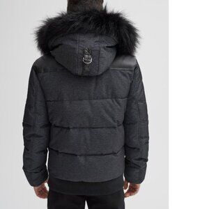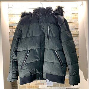 It features a textured melange fabric, removable hood with faux-fur trim, vegan sherpa-lined hood and collar, vegan leather blocking, ribbed storm cuffs, and fleece-lined hand-warming pockets.