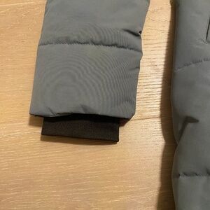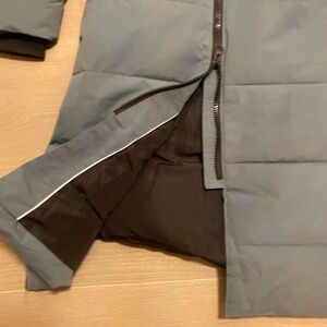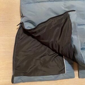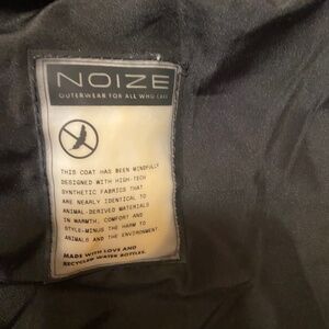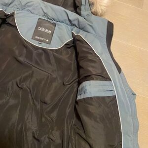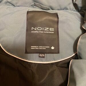 NOIZE winter coat in light blue , quilted with side zips and 2 way front zipper for easy movement. Ribbed cuff on sleeve for warmth.. Removable faux fur hood attached with zipper and velcro. Size XS, Content 100% polyester. Designed in Canada.