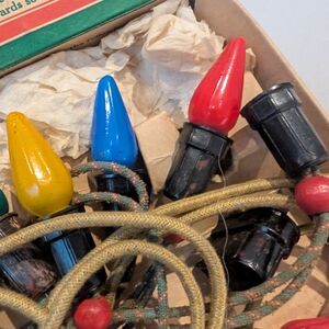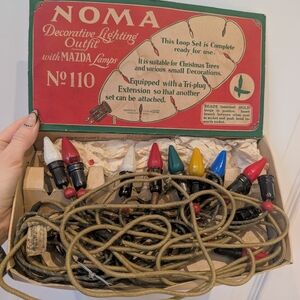 Vintage NOMA decorative lighting set with colorful Mazda lamps. Includes red, white, blue, yellow, and green bulbs. Perfect for holiday decorations.
