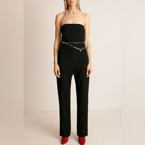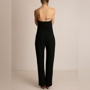 Strapless jumpsuit in double crepe fabric with hidden boning inside bust, fabric encased elastic in back for added stability.