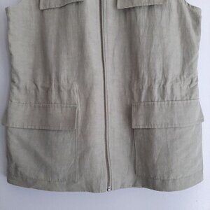 • Lightweight lyocell linen blend full zip vest in sage green with two faux chest and two lower front pockets.