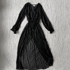 Long sleeve, plunging neck, sheer, high slit front , bnwot black dress