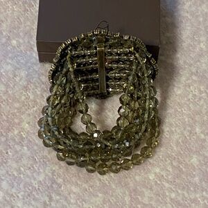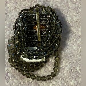 Goes around your wrist with 6 strands of beads on clear stretchy string similar to fishing line. Beads are smoky grey in colour with lots of sparkle.