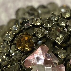 Metal has an aged or rubbed bronze appearance. Rhinestones on the front are a combination of clear, pink and amber. There is one stone missing as shown in photo above. This would not be noticeable when worn.