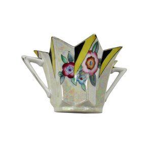 This rare Noritake sugar bowl, crafted in the Art Deco style, features a striking starburst design with vibrant yellow and floral patterns.