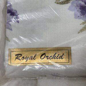 Pattern: A white sheet with a floral pattern of purple orchids.