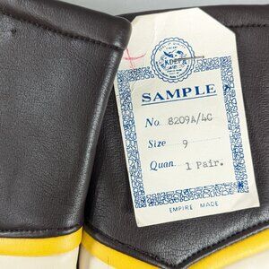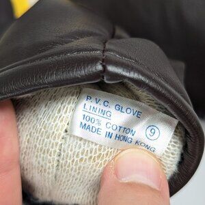 New old stock gloves in brown faux leather with a white and cream coloured chevron mark on the back of the hand. Marked as "PVC Glove, lining 100% cotton, made in Hong Kong, 9"
