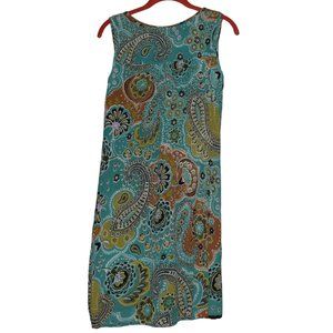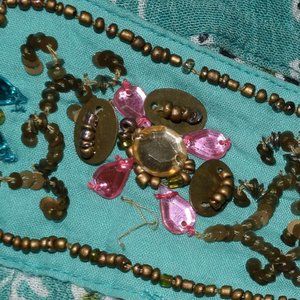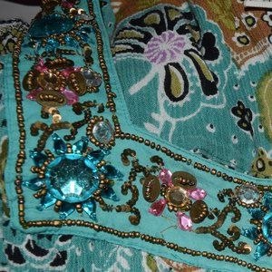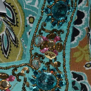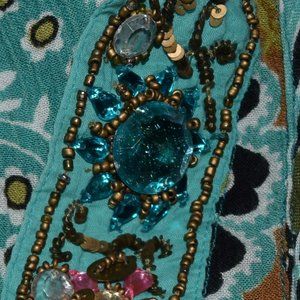 Wonderful Forbidden multi coloured paisley beaded bohemian festival midi dress. Beaded neckline. Beautiful colours! Olive green/purple/tan/pink/blue/aqua. (Please note that there are two stones missing that are hardly noticeable as this is a busy piece. See last two photos.)