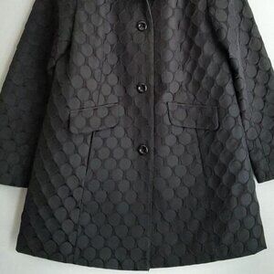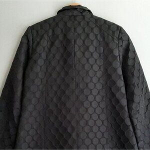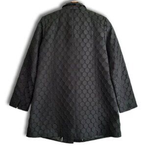• Long sleeve, button down closure coat with two front pockets. Modern, tonal textural large dot/ circle pattern fabric..
