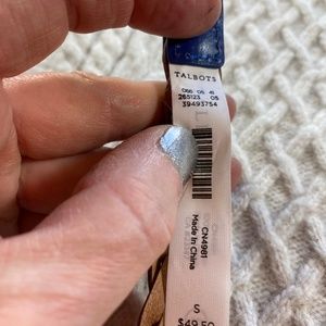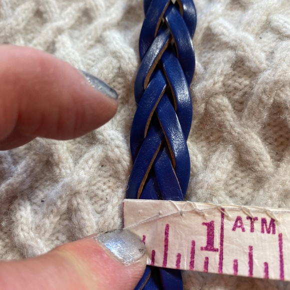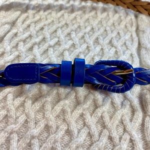 A second blue woven leather belt, this time skinnier at 5/8" width. Made for Talbots, this still has tags on it. Considered size small, it is adjustable along the woven length and measures about 37" from buckle base to end. Assumes 2" overlap wanted.