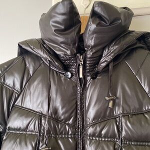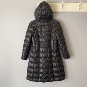 Nuage long black down-filled puffer coat. Size small. A few marks. Minimal wear. Some long stray threads as pictured. Overall, great coat.