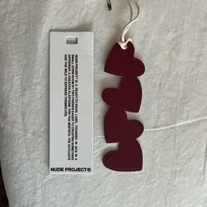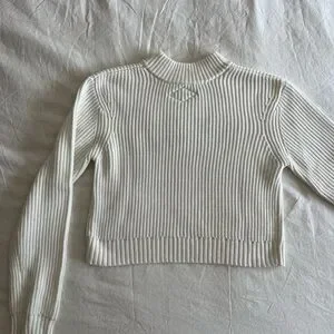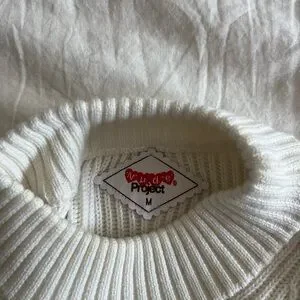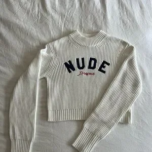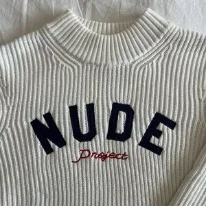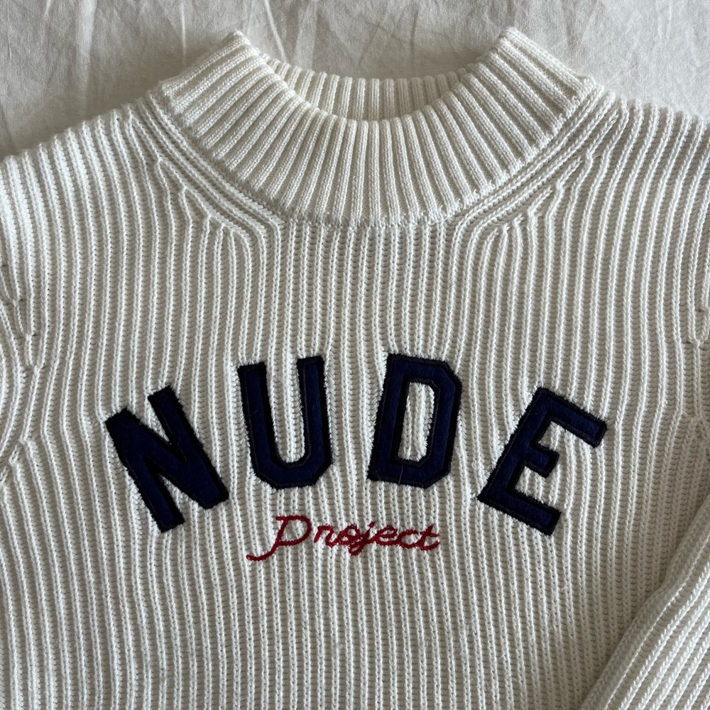 White ribbed sweater with 'Nude Project' logo in navy and red.