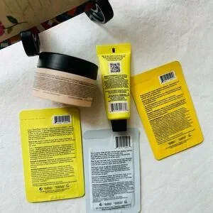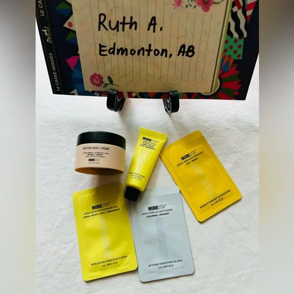 NUDESTIX skincare set includes a body creme and skincare products. Features vibrant yellow and cream packaging.