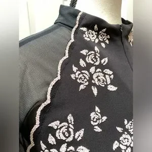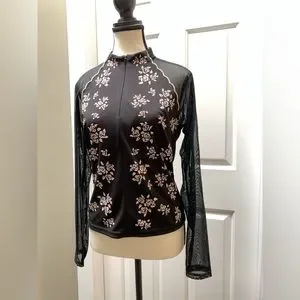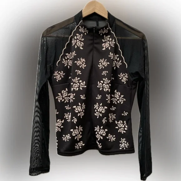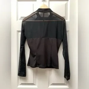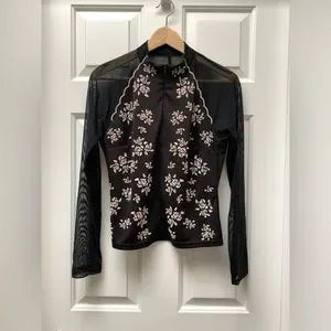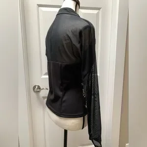 Cool pretty top with half hidden front zip and dolman mesh sleeves.