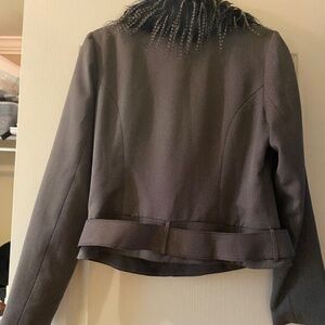 Tailleur NUEVA avec Jupe, fourrure artificielle sur le collet du veston gris, noir et blanc grandeur 10 81% polyester et 19% rayonne