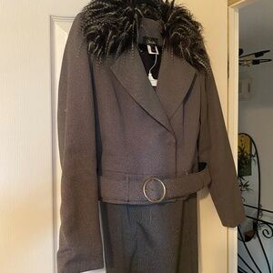 NUEVA Skit Suit with faux fur on the collar grey, white and black, size 10, 81 % polyester 19 % rayon