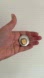 Nuri brooch in silver and gold tone metal has a moon man face in gold surrounded by a silver circle. The moon face is not centred. Loop on back to convert to a pendant. Note the pin is not very long. Signed Nuri on the back.