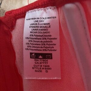 Red corset and head piece as part of a nurse costume. Perfect for Halloween. Corset is a size S. Corset has had one small hole fixed by hand, see last photo. Head piece has some glue showing at each end of head band, shown in second last photo.