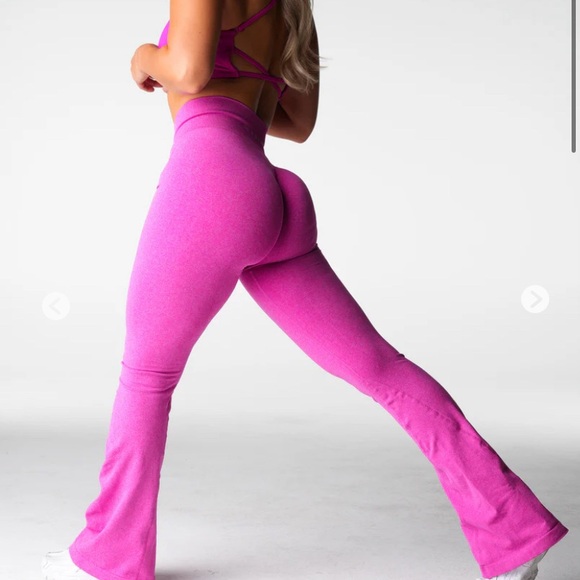 Stylish pink leggings with a flattering flare design. Perfect for workouts or casual wear. Comfortable and stretchy fabric.