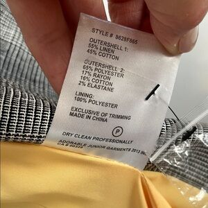 Stylish NVLT blazer with a charcoal grey base and black pinstripe accents. Double-breasted Asymetric design for a modern look. One button closure with additional inside button closure. Ideal for the office or weekends with jeans and heels. Fully lined in a pretty yellow lining. Side slits and lower back. Pockets are closed and extra button included. New without tag.