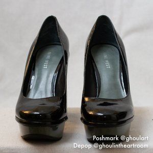 Nine West patent platform pumps with grey block heel. Small lift on inner of left platform, undetectable from normal viewing distance. Sole wear is as photographed.