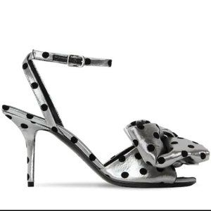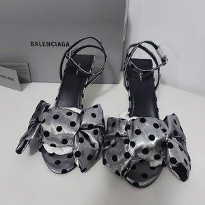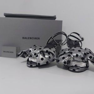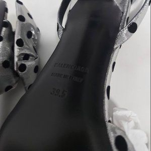 Brand new in box authentic Balenciaga knife polka dot bow heels in silver and black. The heels are open toe with a crossed ankle strap. Comes with the the original box, dust bag, extra heel tips, and Balenciaga card [see image 6]. Made in Italy.