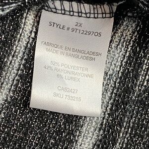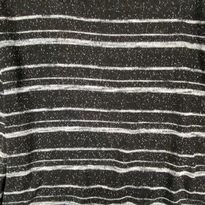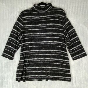Women’s Size 2X. Poly/Rayon/Lurex blend. Black knit with grey / white striping and silver sparkle threads throughout. Cowl Neck. Half Sleeve. Long Body