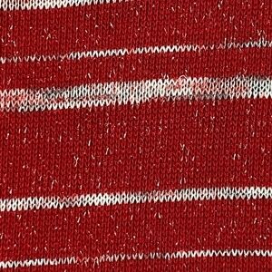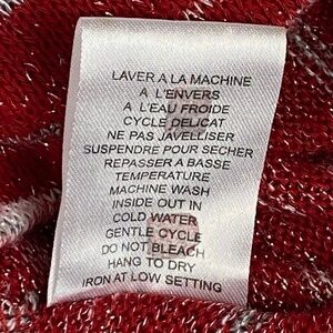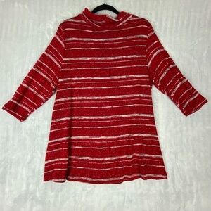 Women’s Size 2X. Poly/Rayon/Lurex blend. Red knit with grey / white striping and silver sparkle threads throughout.Cowl Neck. Half Sleeve.