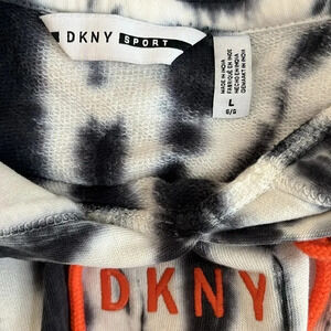 DKNY SPORT NWOT Sweatshirt dress with pockets and hoodie. 100% Cotton tie dye material machine washable. White with black and bright orange DKNY logo and drawstring. Raw edge on bottom and arms.