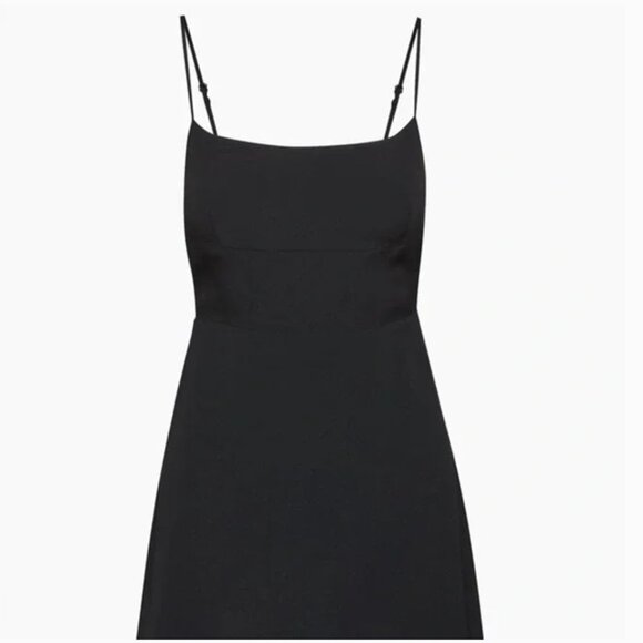 This is a classic mini dress with adjustable straps and a smocked back panel. It’s made from drapey crepe fabric with a subtle pebbled texture.