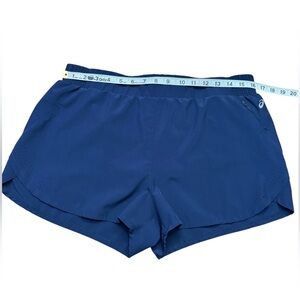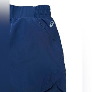 Asics women's athletic shorts. Perfect for running, training, or any physical activity. Made from a lightweight, breathable fabric in a classic navy blue color. Features an elastic waist with an internal drawstring for a perfect fit, and built-in briefs for added comfort and support. Laser perforations on the sides enhance ventilation. A convenient zippered pocket is located on the side, and there is also a mini pocket inside to securely store your keys or small essentials. This is a size Large.