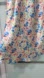 The dress in new condition is a knee-length, form-fitting piece made from a shiny, satin-like fabric. It features a multicolored floral print with shades of blue, pink, and green on a light, reflective background, giving it an elegant and eye-catching appearance.