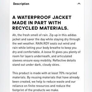 NWOT Adidas MYSHELTER RAIN.RDY Jacket in Black Size XS