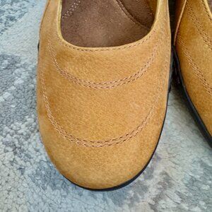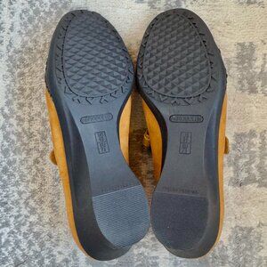 New without tags or box, Aerosoles Tornado Mary Jane wedges in a mustard-tan suede, black rubber wedge sole, and adjustable patent detailed velcro strap. Size 9.5. Cushioned footbed. Cat friendly, nonsmoking home.