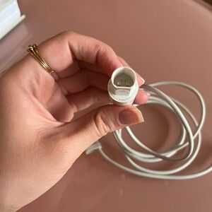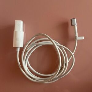 White Apple MagSafe power adapter with magnetic connector.