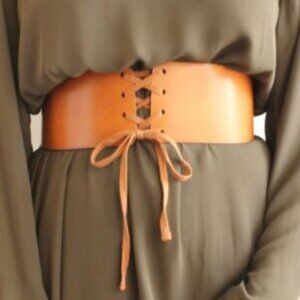 BABATON ARITZIA Smooth Leather light brown corset belt. Thick durable outer leather with softer leather lining on interior. Brass hardware. Lace up detail in middle of the belt.