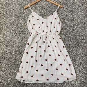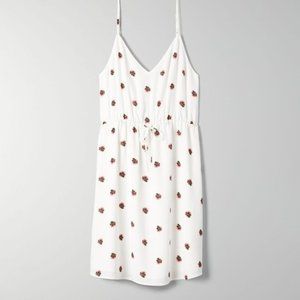 This is a sleeveless dress with a double-V neckline and a cinchable elastic waist. It's made with fluid, drapey fabric in a custom floral print that's exclusive to the brand.