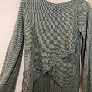 Aritzia Babaton Kitano crossover back sweater in Heather Lily Pad (greenish) wool and linen blend knit. This sweater is knit with a wool-linen blend that’s lightweight yet warm. The crossover back is cut to show a glimpse of skin when you move, while precision tailoring ensures a flattering fit that keeps its shape.