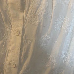 This blouse has never been worn. White flowy fabric with subtle white floral embroidery. Wide neckline with ruffled sleeves and a functioning button front. This piece is so pretty but ended up being too big for me -- tag says S but due to the neckline (and my lack of boobs) it fits more like a M. A summertime boho dream!