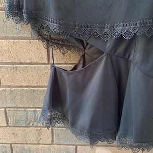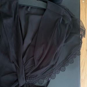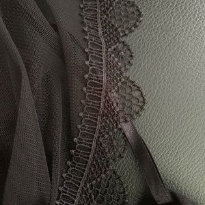 Never worn, intricate lace and mesh drape beautifully over this low V, side cutout top. Hidden zipper under sleeve, shown in photos.