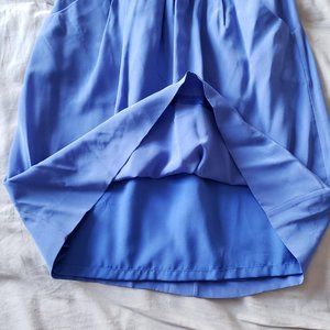 This silk dress is absolutely stunning in person in beautiful hydrangea blue. The fabric can be adjusted to wear as a cowl neck or boatneck. The modern racerback design is stylish and sexy. The waistband is stretchy and there are functional front pockets! Perfect for wedding, prom or a special night out!