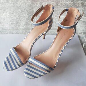 NWOT never worn BCBGeneration stripe white and blue fabric open toe heeled ankle tie sandal
